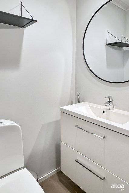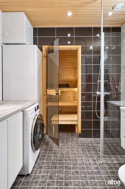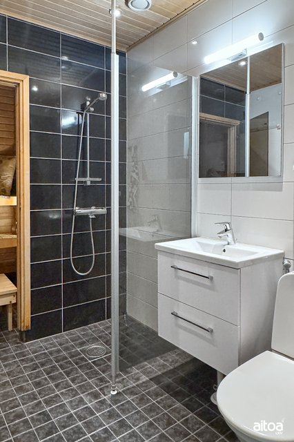 - WC-istuin, suihku, pesukoneliitäntä, peili, pesuallas, allaskaappi, bidee-suihku, lattialämmitys, ja kaapisto ja työtaso