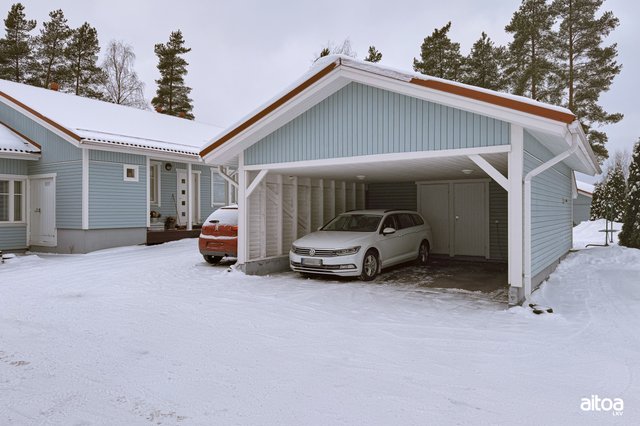 Asunnon yhteydessä on oma terassi, jossa voi nauttia kesäpäivistä. Piha-alue on viihtyisä ja suunniteltu monipuoliseen käyttöön. Jokaiselle huoneistolle kuuluu oma autokatos- ja autopaikka, mikä tekee arjesta sujuvaa.