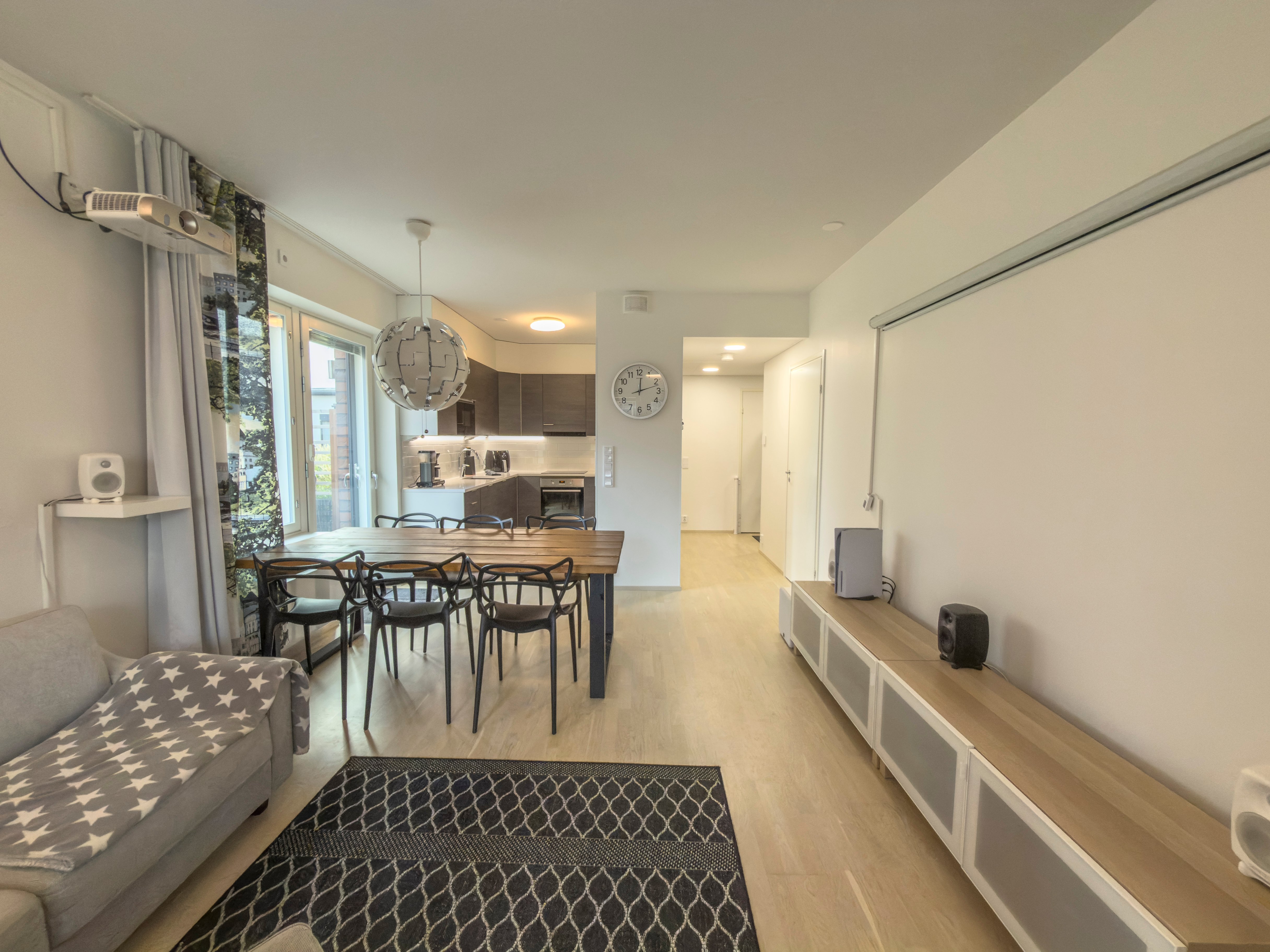 Asunnon moderni keittiö on varusteltu integroiduilla kodinkoneilla ja kvartsikomposiittitasoilla, ja tilavasta olohuoneesta on käynti sekä parvekkeelle että pienelle pihaterassille. Kaksi makuuhuonetta tarjoavat rauhalliset puitteet, ja suuremmassa makuuhuoneessa on runsaasti kaappitilaa. Asunnon sauna ja kylpyhuone ovat korkeatasoisesti varusteltuja, ja erillis-WC:ssä on kodinhoitotilaa pyykinpesukoneelle ja kuivausrummulle.