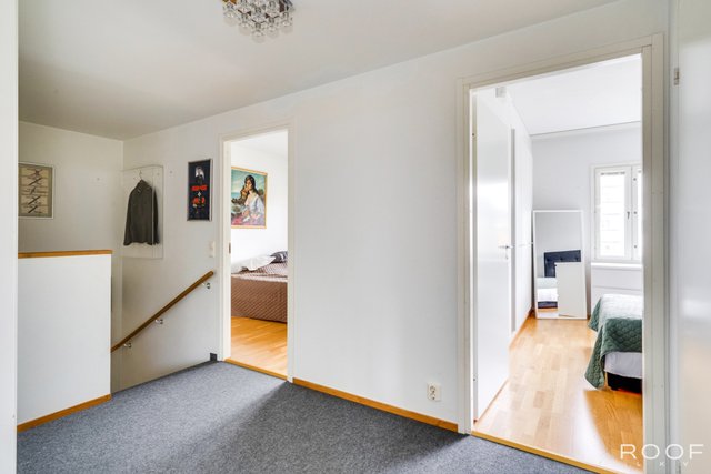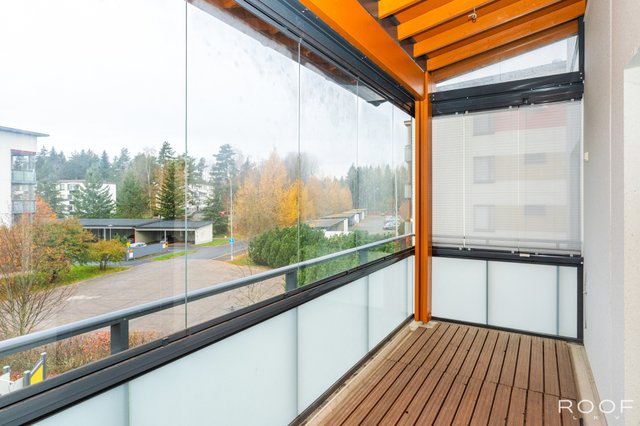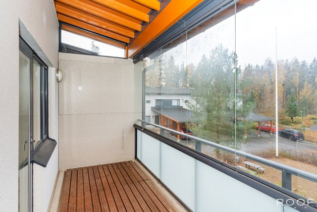 Yläkerran päämakuuhuoneesta kulku lasitetulle parvekkeelle, joka on myös länsisuuntaan. Yläkerrasta löytyy makuuhuoneiden lisäksi myös erillinen kodinhoitohuone, erillinen wc sekä kylpyhuone- ja saunaosasto. Asunnon yhteydessä ulkovarasto.