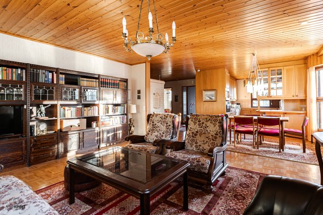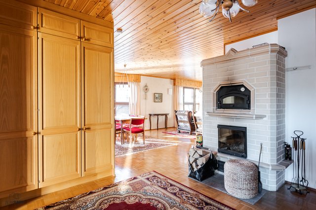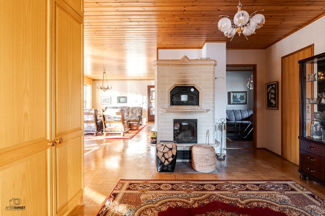 - Avara olohuone, jossa varaava takka.