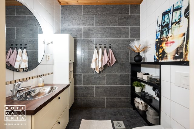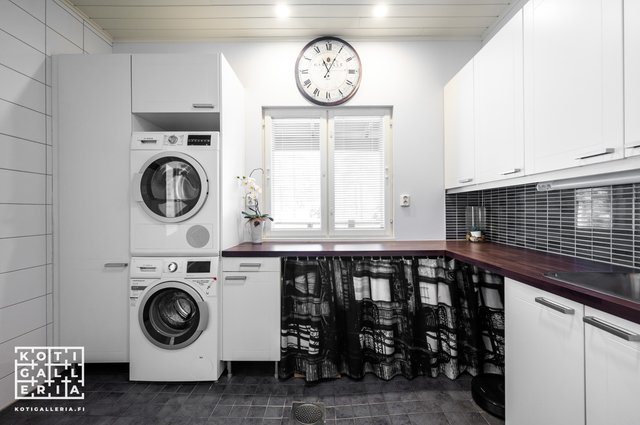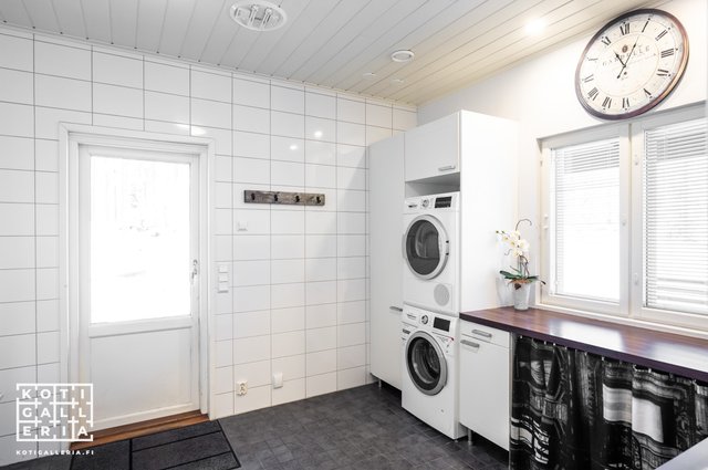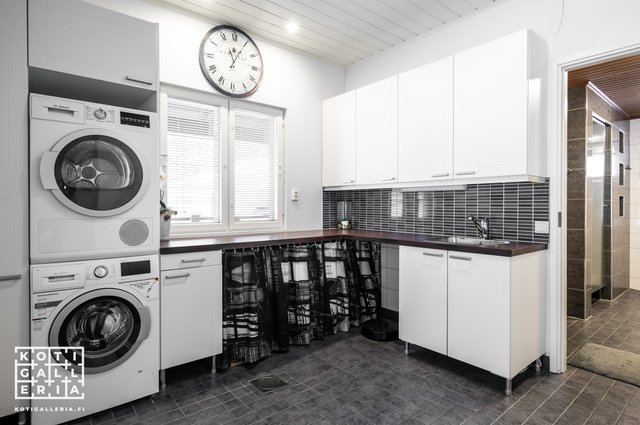 - Pesukoneliitäntä, tila pesutornille, lattialämmitys, ja pesuallas