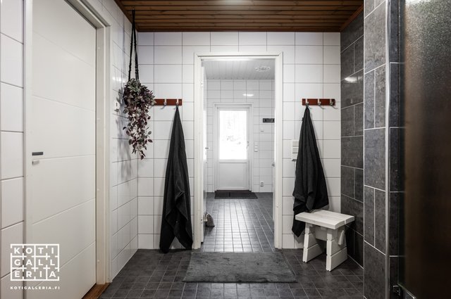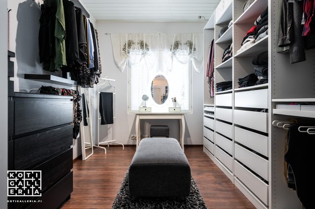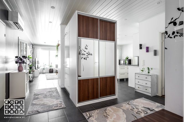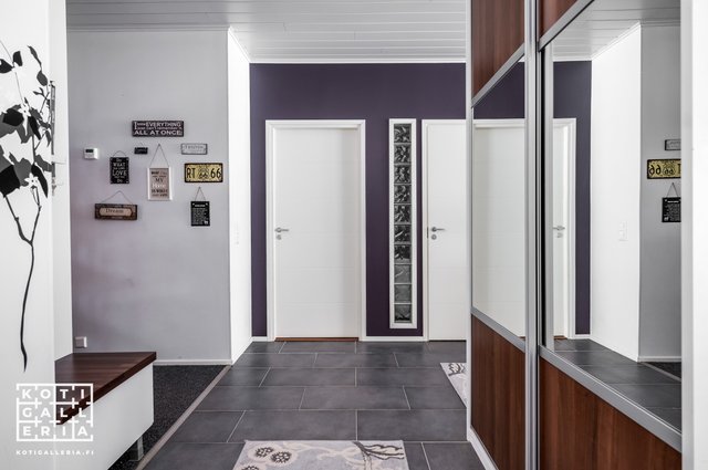 - Vaatehuone/varastohuone (käynti eteisestä) lattiassa laminaatti Eteisessä isot peililiukuovikaapistot, lattia laattaa