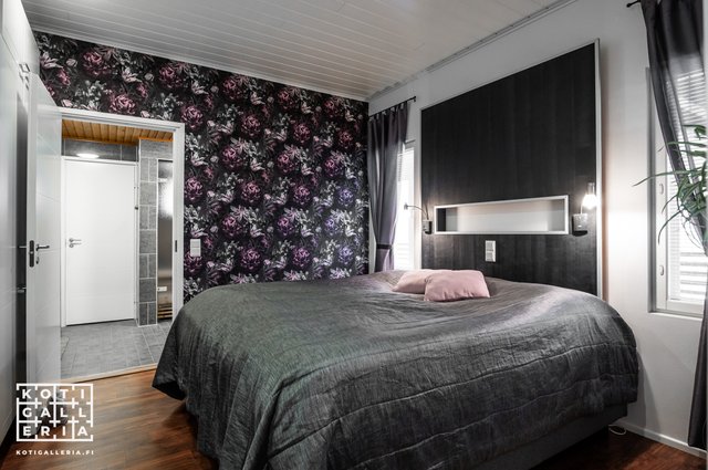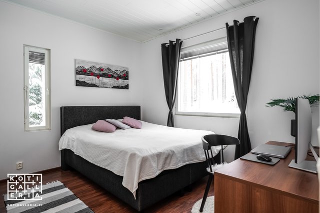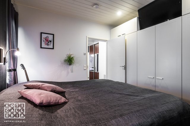 - Yhdestä makuuhuoneesta käynti kylpyhuoneeseen, kolmessa makuuhuoneessa kiinteät komerot