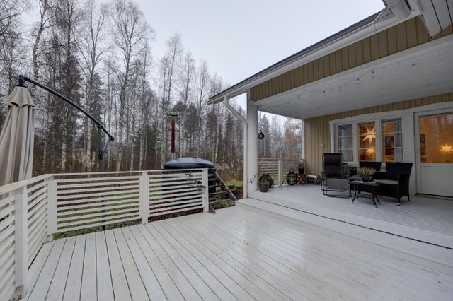 - Takapihalla terassi joka osittain katoksen alla. Terassilla puilla lämpiävä palju