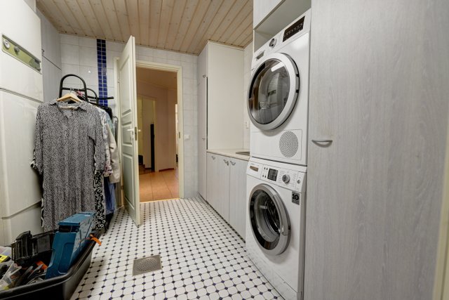 - Pesukone (kuuluu kauppaan), kuivausrumpu (kuuluu kauppaan), pesukoneliitäntä, ja tila pesutornille