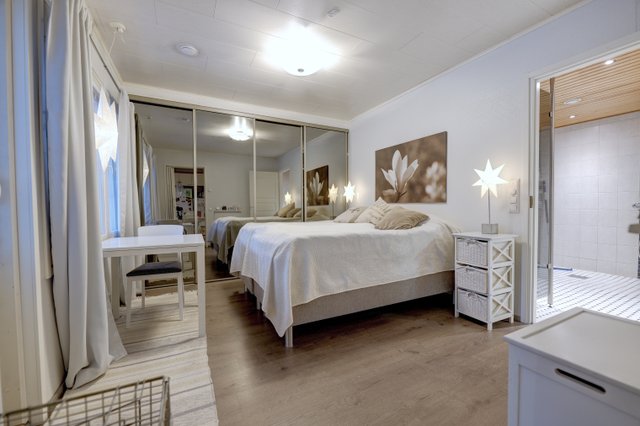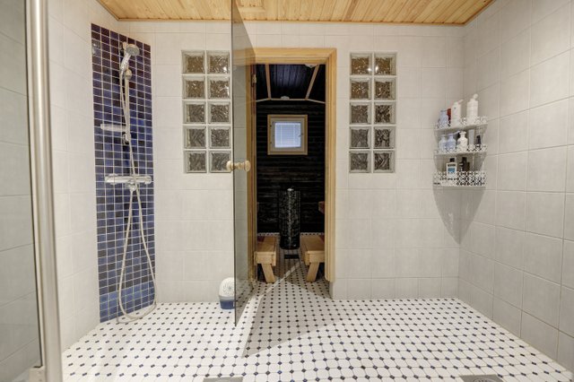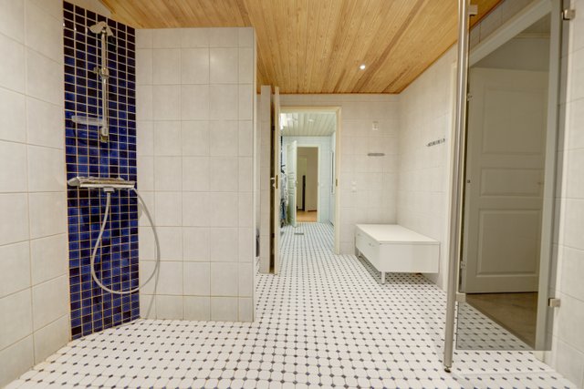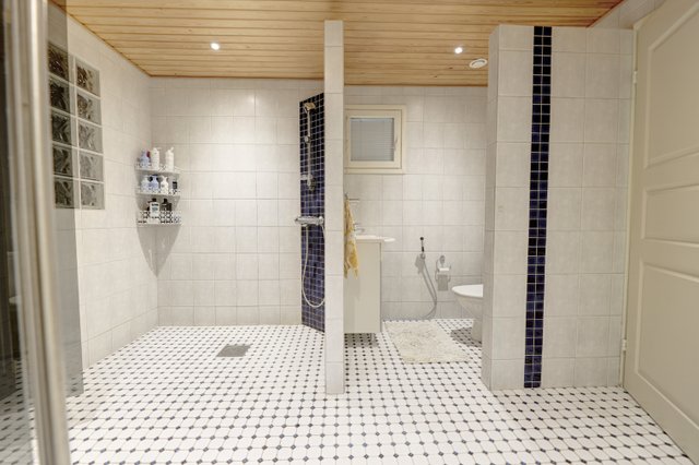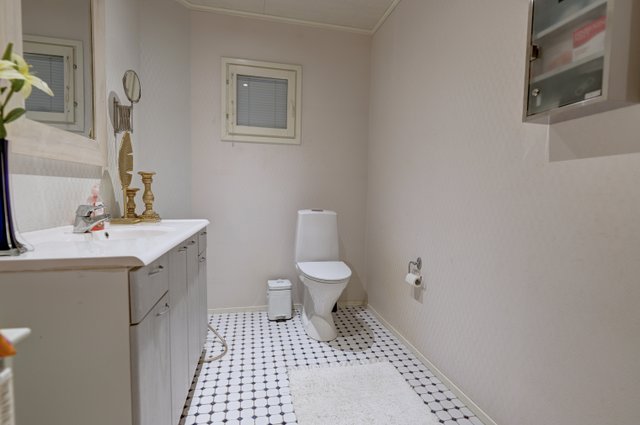 - WC-istuin, suihku, lattialämmitys, peili, allaskaappi, pesuallas, ja bidee-suihku