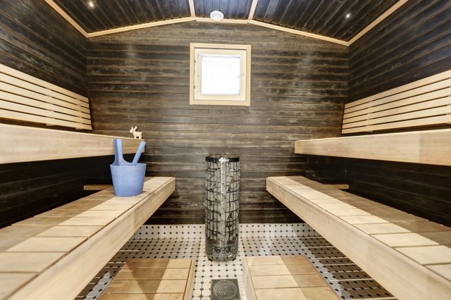 Sauna on tyylikäs, tummilla seinillä ja vaaleilla lauteilla varustettu, ja keskellä komeilee Harvian kivitornikiuas. Saunan jälkeen voit rentoutua takapihan terassilla, jossa on palju. Syksyn ja talven pimeinä iltoina on mahtavaa rentoutua lämpimässä paljussa tähtitaivaan alla.