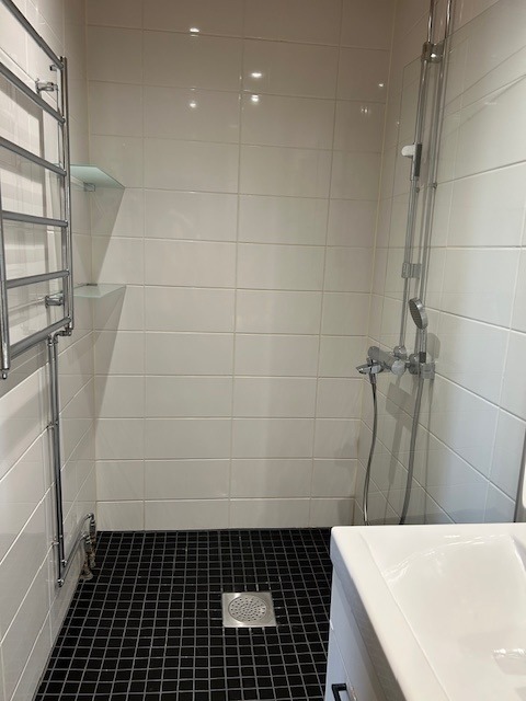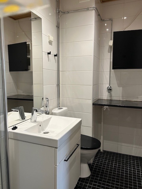 - Remontoitu kylpyhuone, jossa suihku, suuihkuseinä, allas, peili, allaskaappi, wc-istuin, pesukoneliitäntä.