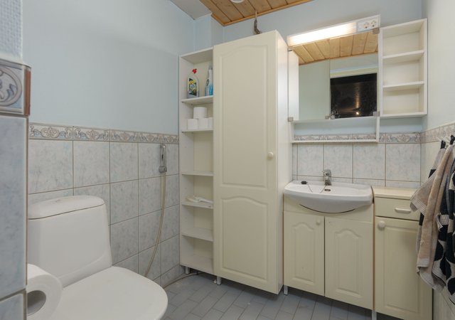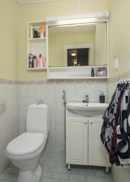 - Molemmissa kerroksissa erillinen WC. Varustus: Allas, Allaskaappi, Peilikaappi, Bidee, WC-istuin, Lattialämmitys. Seinämateriaali: Osalaatoitus Lattiamateriaali: Laatta