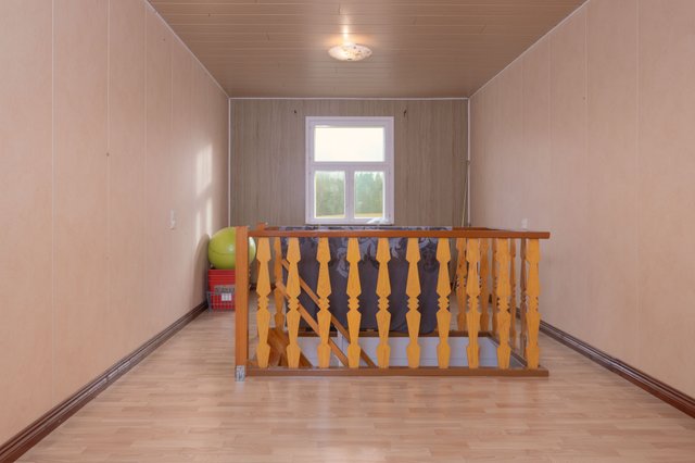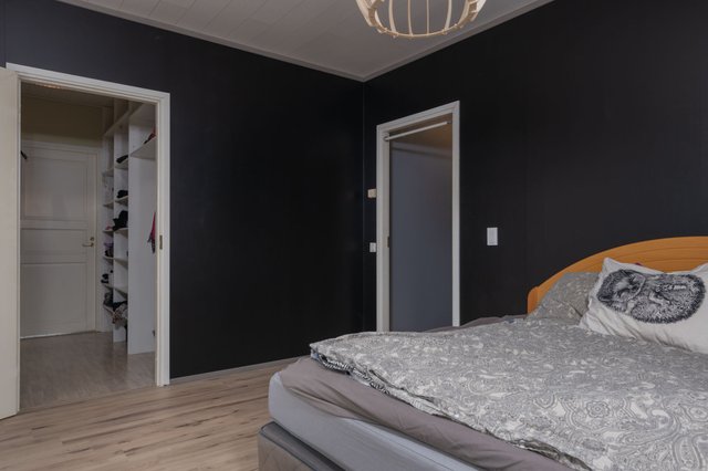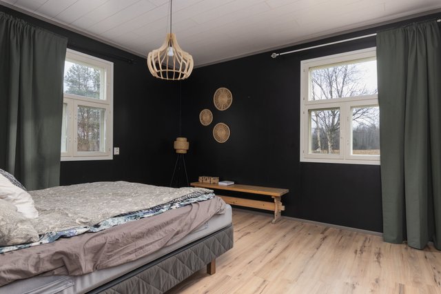 Yläkerran yhdessä makuuhuoneessa lattia on tehty uusiksi ja seinät maalattu.