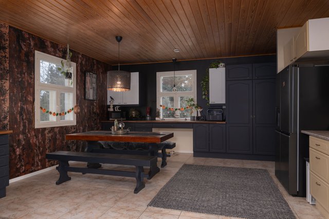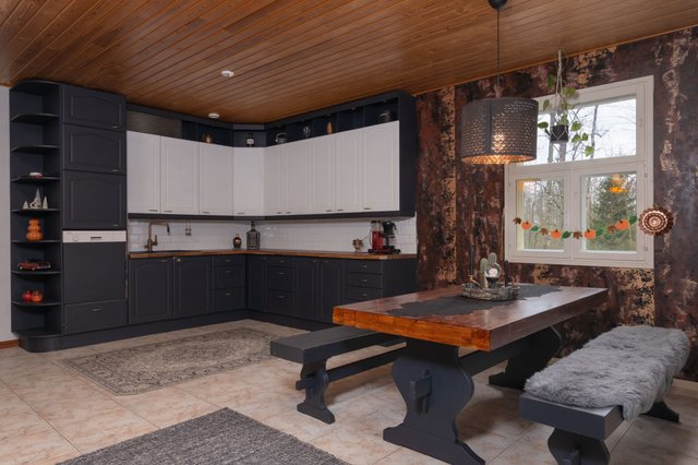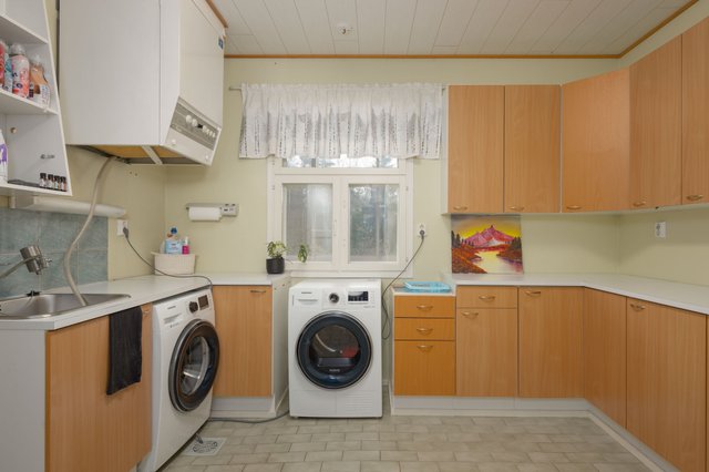 - Varustus: Induktioliesi, Liesituuletin, Uuni, Hana, Kaapisto, Allas, Astianpesukone, Jääkaappipakastin, Leivinuuni ja liesi Seinämateriaali: Laatta, Maali Lattiamateriaali: Laatta