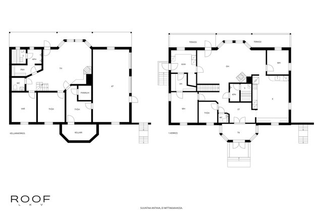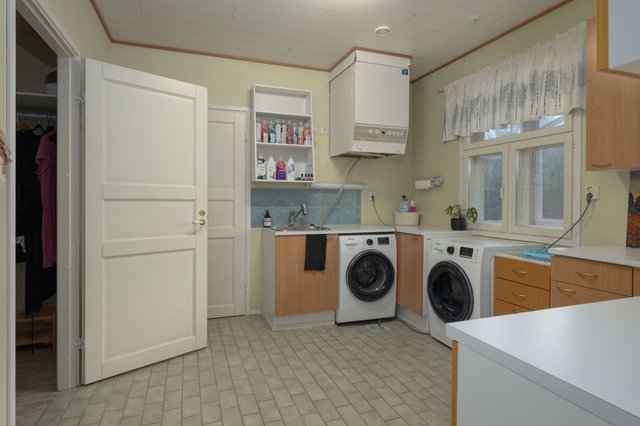 - Epävirallisen rakennus- ja huoneistorekisterioteen mukaan (24.10.2025) huoneistoala on 263 m2, kerrosala on 229 m2 ja kokonaisala 363 m2. Lisäksi talousrakennuksen kerrosala on 29 m2. Muut tilat pääpiirustuksen (pohja) mukaan: Autotalli 48,5 m2 Lämmönjakohuone 3,5 m2 Kellari 9,3 m2 Pinta-alaa ei ole tarkistusmitattu. Edellä mainitut pinta-alat saattavat tämän ikäisessä kohteessa poiketa olennaisestikin asuinrakennusten nykyisten mittaustapojen ja standardien mukaan laskettavasta asuintilojen pinta-alasta. Asuinrakennuksen todellinen asuinpinta-ala voi siis olla esitteessä mainittua pienempi tai suurempi. Ainoa tapa varmistua todellisista pinta-aloista on teettää pinta-alojen tarkistus