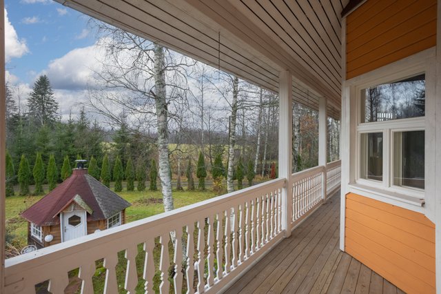 Yläkerrassa sijaitsevat veranta, eteinen, olohuone, kolme makuuhuonetta sekä tilava keittiö, jossa on leivinuuni ja puuhella. Lisäksi yläkerrasta löytyvät puusauna, suihku, kodinhoitohuone, vaatehuone ja erillinen wc.
