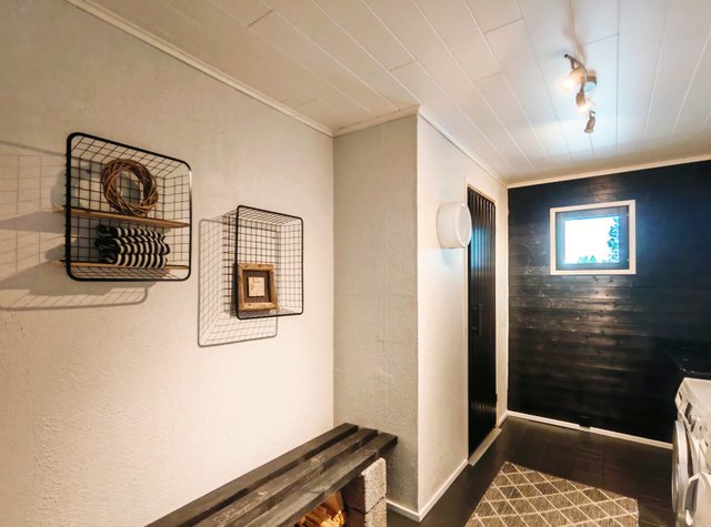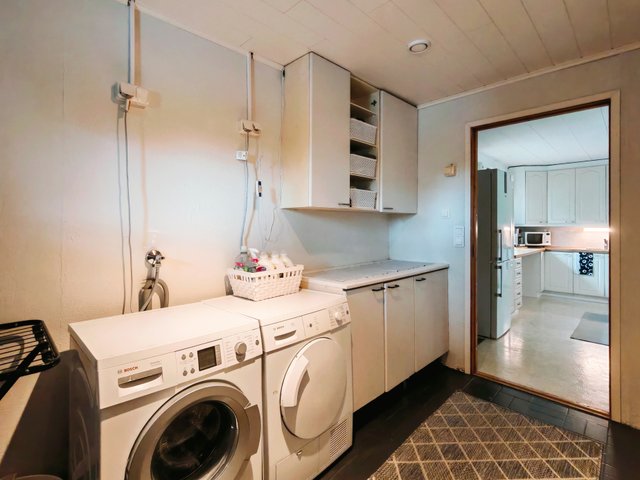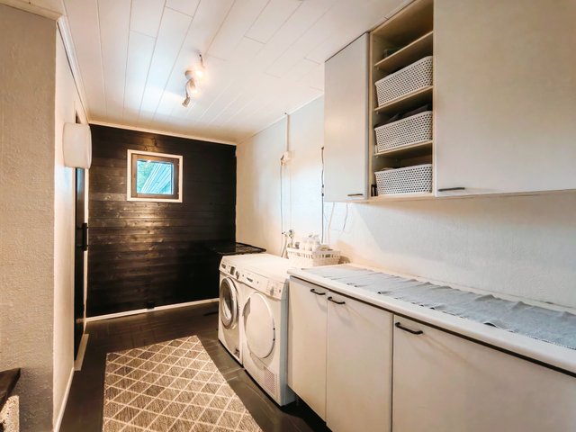 - Pesukoneliitäntä, lattialämmitys, lattiakaivo, pyykkikaapit, ja pöytätaso