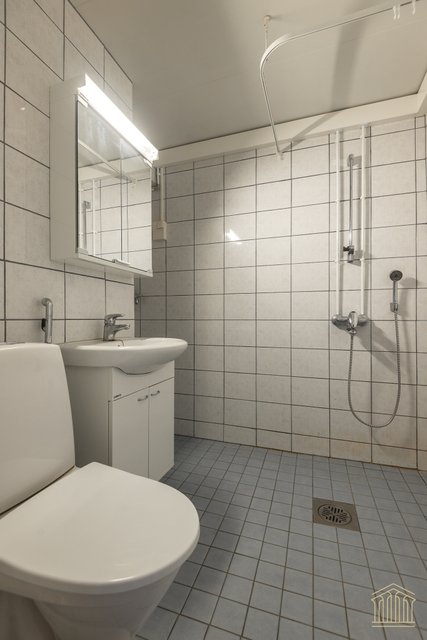 - WC-istuin, suihku, peilikaappi, pesukoneliitäntä, allaskaappi, bidee-suihku, lattialämmitys (sähköinen), ja pesuallas
