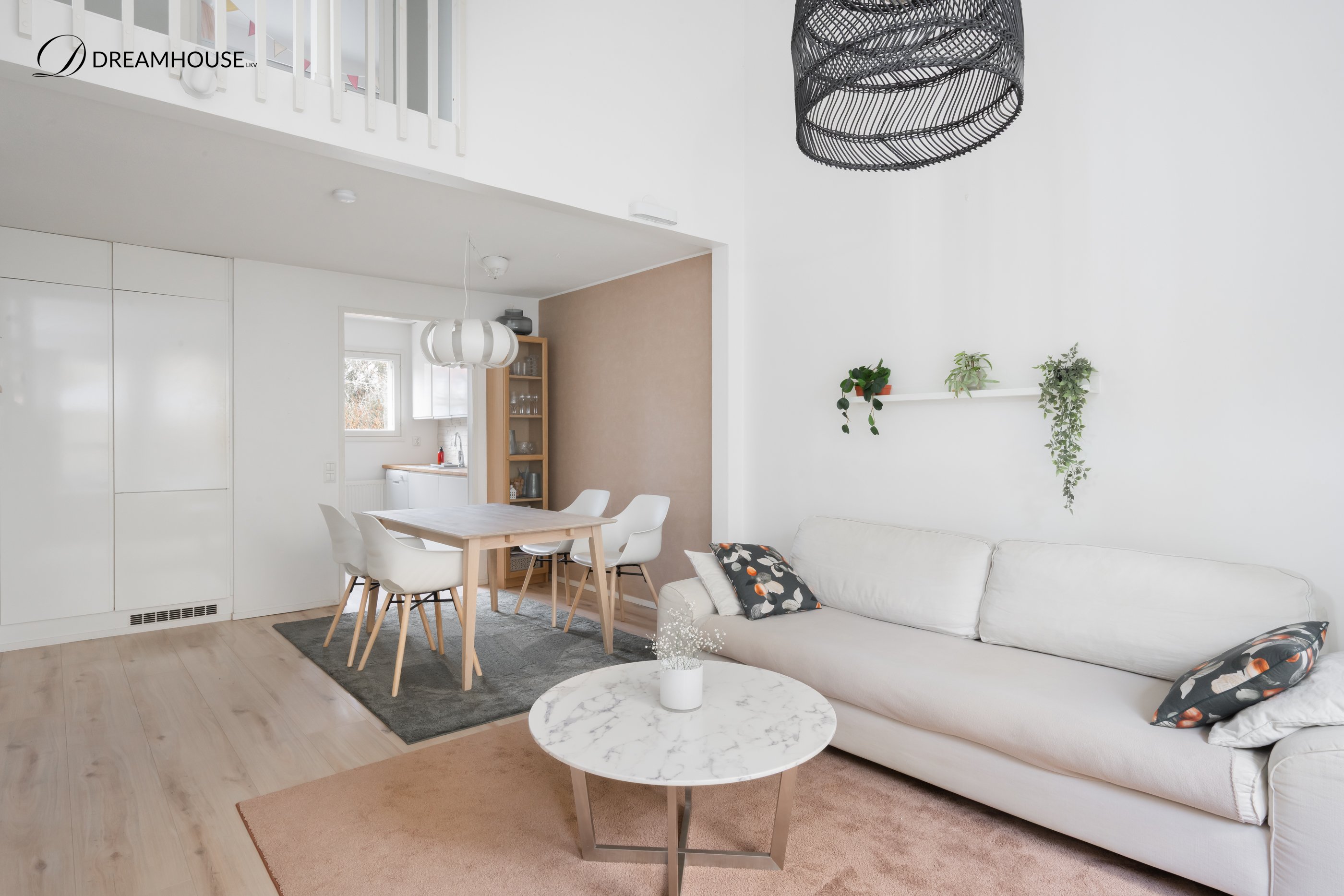 Alakerrassa on tilava ja valoisa olohuone, jonka korkea kattokorkeus tuo lisää tilan tuntua. Olohuoneesta on käynti omalle suojaisalle terassipihalle, joka on aidattu. Keittiössä on tilaa kokkailla, sen viereen mahtuu hyvän kokoinen ruokapöytä. Vielä lähes uudenveroinen kylpyhuone on remontoitu vuonna 2020. Kylpyhuoneen yhteydessä on sauna. Yläkerrassa on kaksi makuuhuonetta. Säilytystilaa on kaapistoissa ja häkkivarastossa. Yhtiö lämpiää kaukolämmöllä ja siellä on valokuitu.