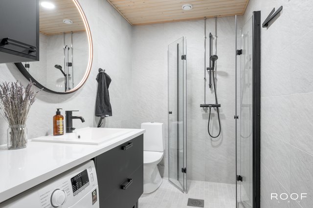 - Varustus: Wc-istuin, suihku, suihkukulma taittuvilla ovilla, pesukoneliitäntä, lattialämmitys, valopeili, kaappi, kylpyhuonekaapisto. Seinät: Kaakeli. Lattia: Laatta.