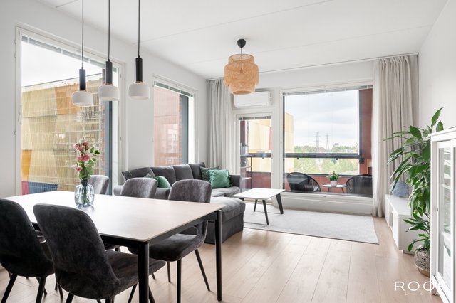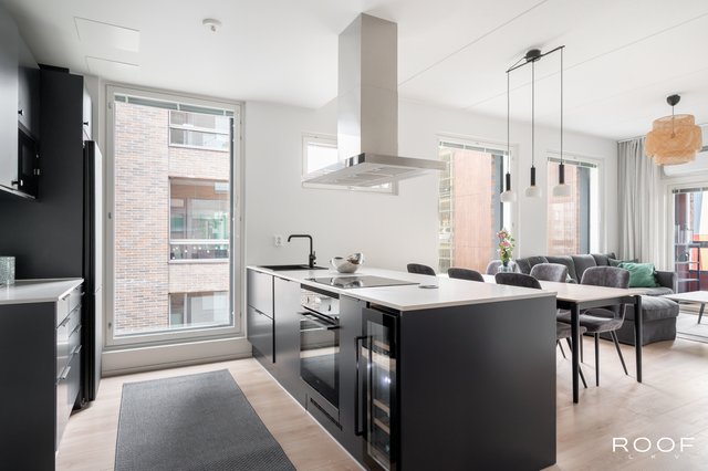 Tervetuloa tutustumaan tähän poikkeuksellisen hyvin suunniteltuun läpitalon huoneistoon, jossa yhdistyvät arjen helppous, esteettisyys ja toiminnallisuus. Erikoissuunniteltu keittiö kvartsitasoineen ja saarekkeineen tekee ruoanlaitosta nautinnon ja ruokailutila sulautuu saumattomasti osaksi avaraa olohuonetta. Olohuoneen jatkeena on asunnon toinen lasitettu parveke.