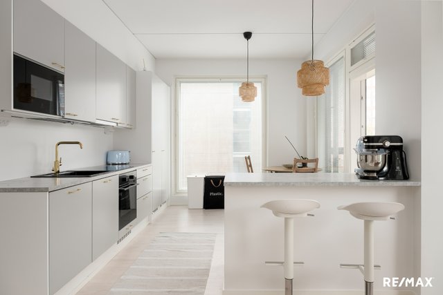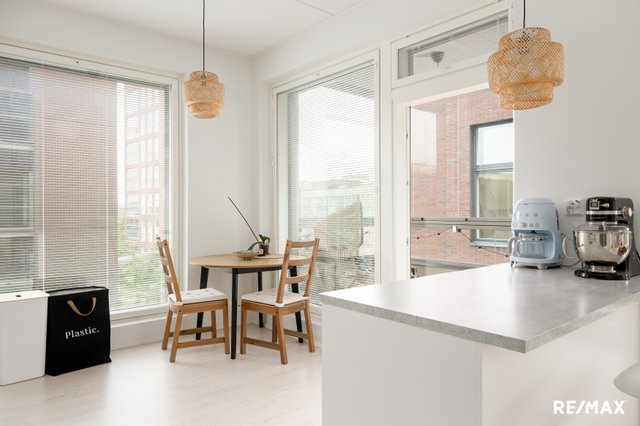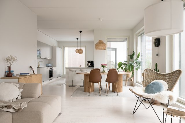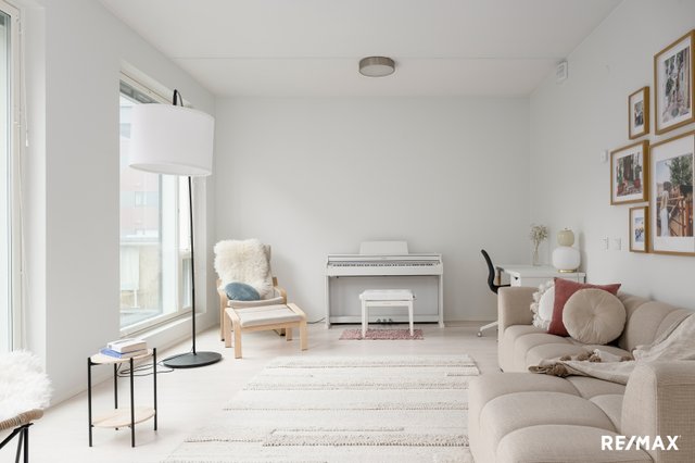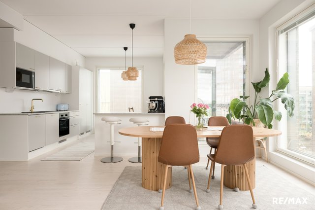 Tämä 96,5 m²:n asunto tarjoaa 4–5 huonetta, jotka muuntautuvat helposti elämäntilanteen mukaan – olipa toiveena avara olohuone, työtila tai erillinen vierashuone. Suuret ikkunat tuovat sisään runsaasti luonnonvaloa, ja huoneiston harmoninen värimaailma korostaa kodin modernia ja rauhallista tunnelmaa.