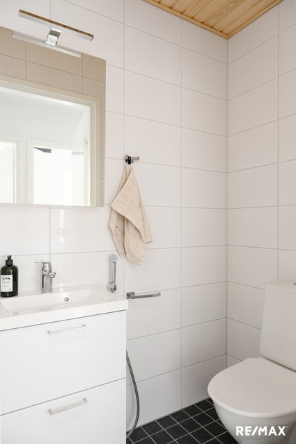 - WC-istuin, suihku, suihkuseinä, peili, pesuallas, peilikaappi, bidee-suihku, lattialämmitys, ja allaskaappi