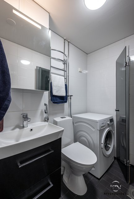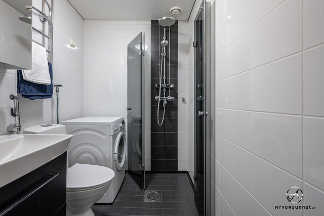 - WC-istuin, suihku, lattialämmitys, peilikaappi, pesuallas, allaskaappi, bidee-suihku, pesukoneliitäntä, ja suihkuseinä