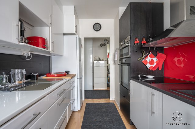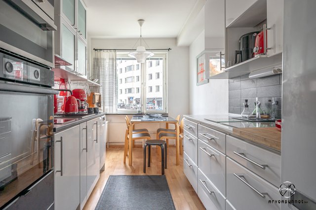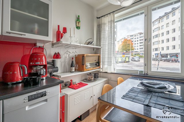 Keittiö on remontoitu 2023, eikä se piiloudu neutraaliin.