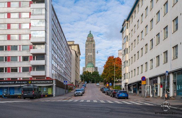 Kirkko näkyy kulman takaa, Lyyran palvelut ja kahvilat ovat korttelin päässä.