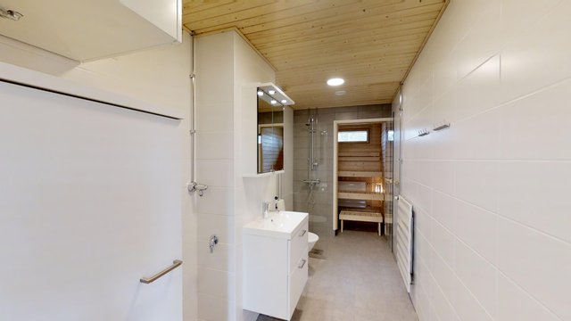 - Suihku, suihkuseinä, pesukoneliitäntä, peilikaappi, pesuallas, allaskaappi, ja bidee-suihku