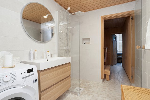 - Suihku, lattialämmitys, peili, pesuallas, allaskaappi, ja pesukoneliitäntä