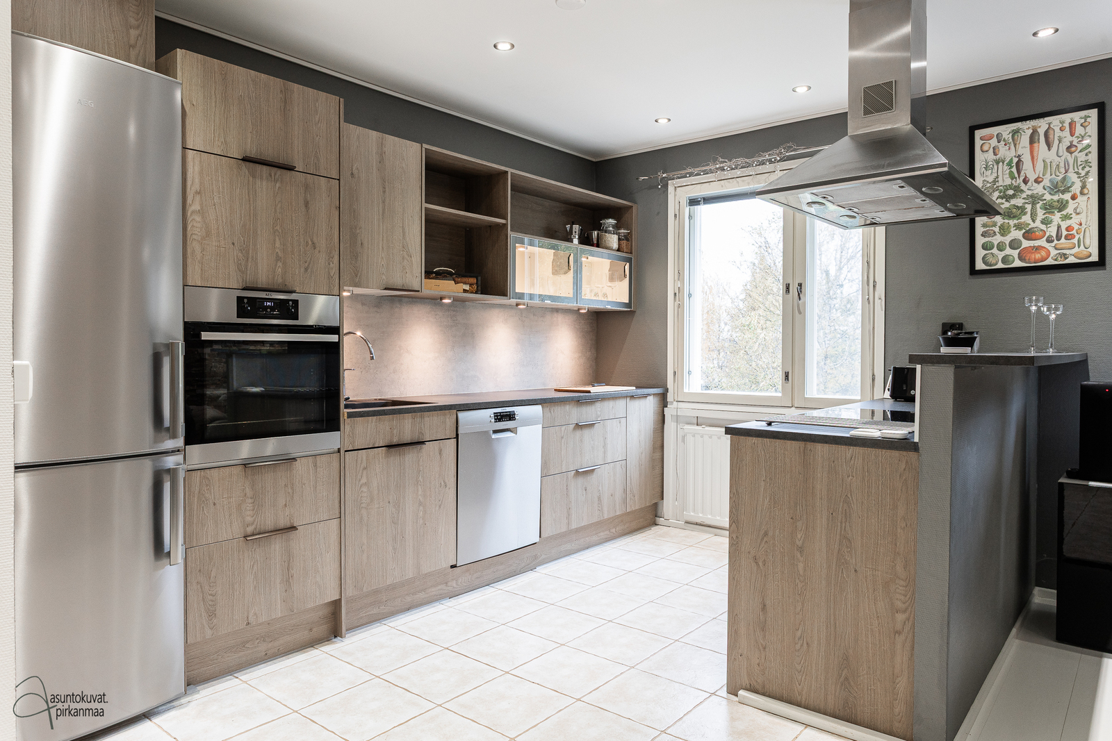 - Keittiö remontoitu v. 2019. Varustus: integroitu erillisuuni, induktioliesi, liesituuletin aktiivihiilisuodattimella, jääkaappi/pakastin, astianpesukone.