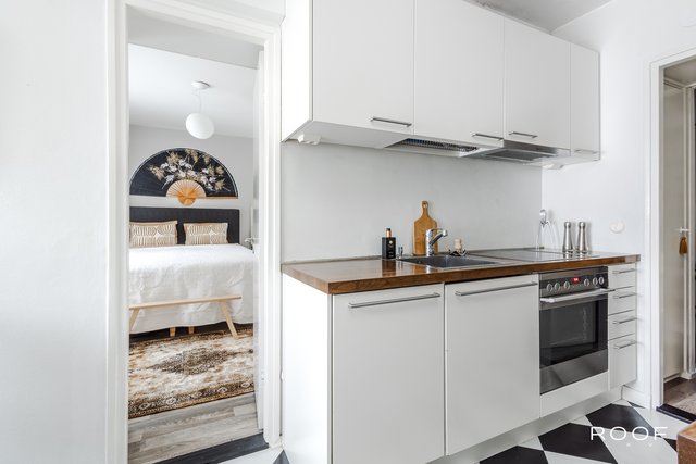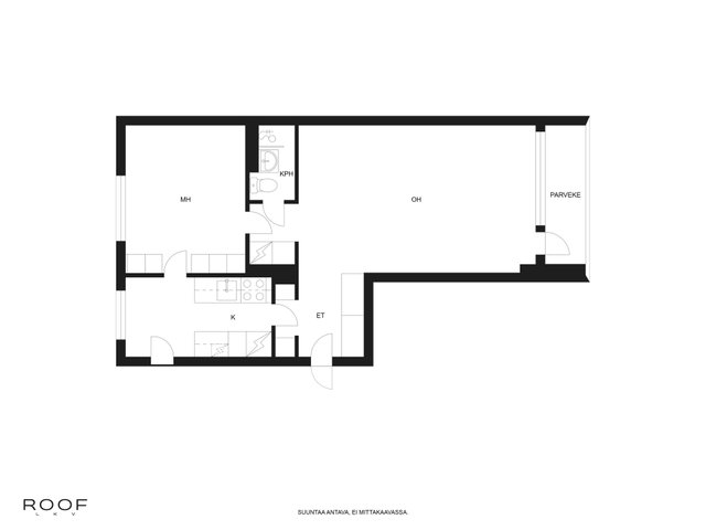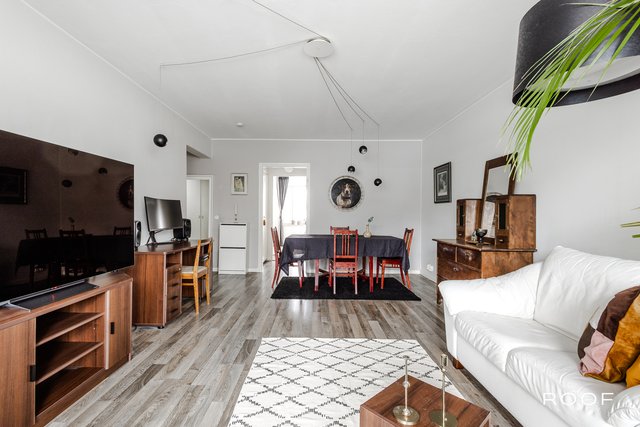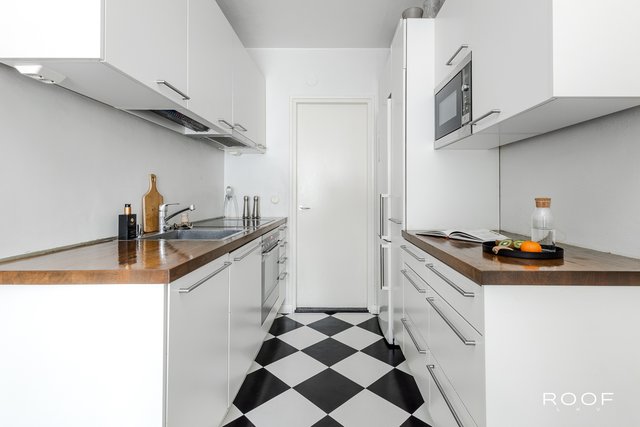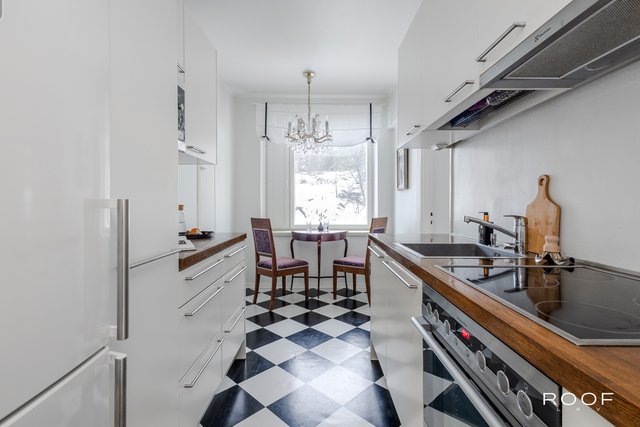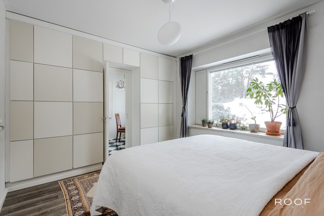 Tämä valoisa läpitalon asunto on ensimmäisessä kerroksessa, mutta rinneratkaisun ansiosta ei katutasossa. Asunnossa yhdistyy 50-luvun charmi ja moderni asumismukavuus. Sen etelään avautuva lasitettu parveke tarjoaa mukavaa oleskelua aikaisesta keväästä pitkälle syksyyn. Asunnossa on moderni keittiö, jossa on hauska mustavalkoruutuinen linoleumlattia. Keittiössä on mukavasti tilaa pienelle ruokapöydälle ja runsaasti säilytys- ja työtilaa. Vesikiertoinen lattialämmitys lisää asumismukavuutta ja on säädettävissä erikseen olo- ja makuuhuoneen sekä keittiön alueelle. Säilytystilasta huolehtii makuuuhuoneeseen asennettu koko seinän kokoinen kaapisto sekä huoneiston komerot. Kellarissa on asunnolle kuuluva oma varastohuone, joka tarjoaa vielä runsaasti lisää säilytystilaa.