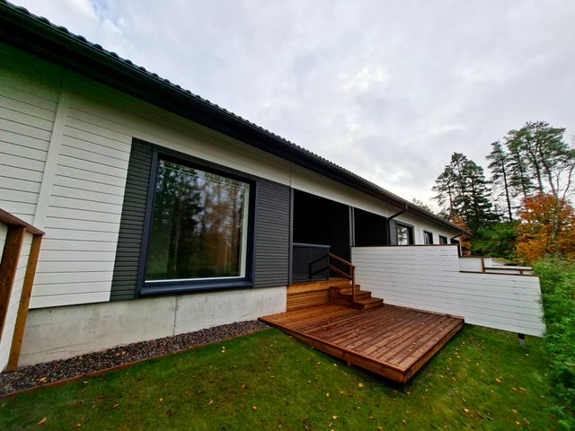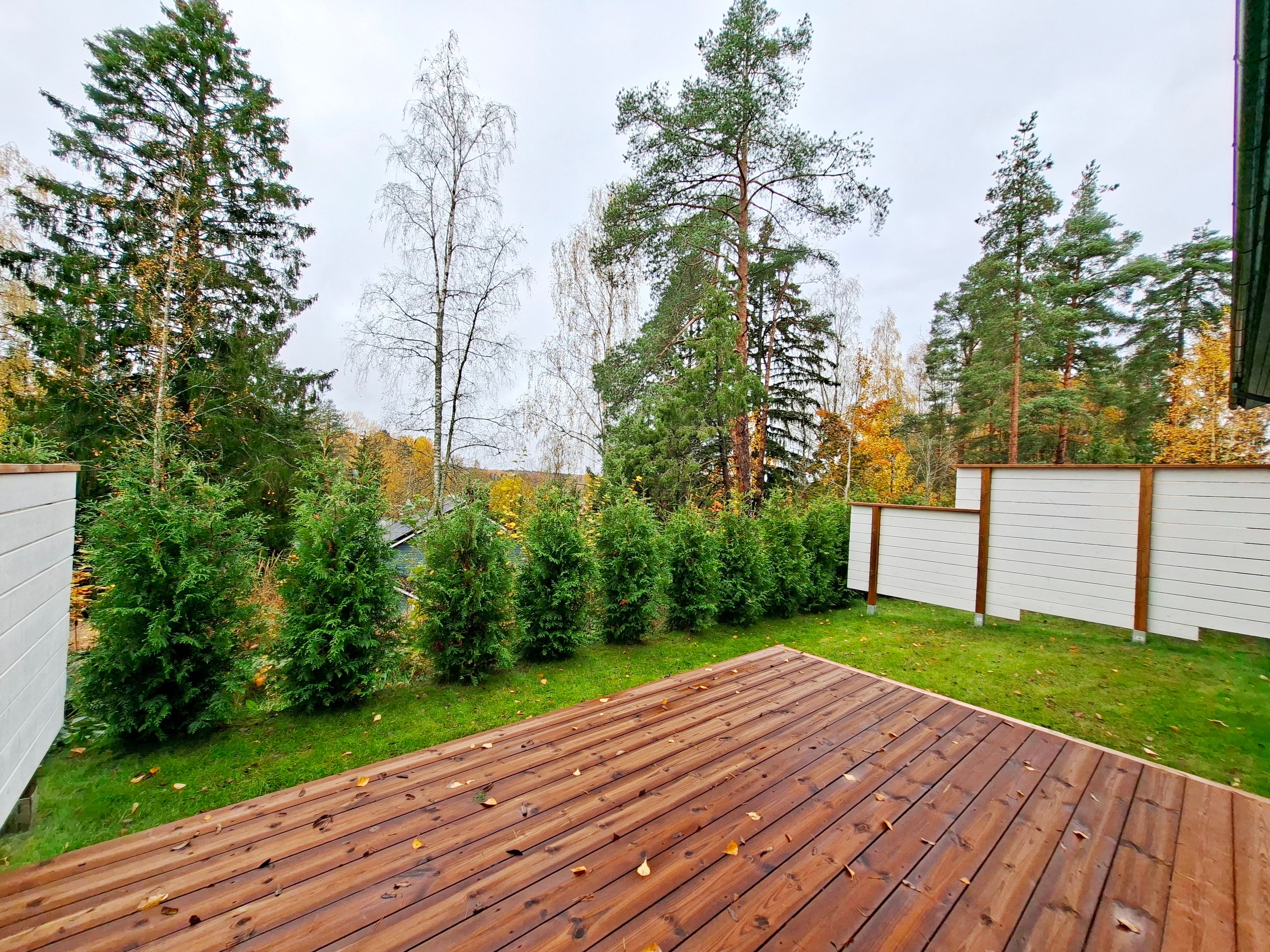 Olohuoneesta avautuvat kauniit näkymät vehreään ympäristöön, ja terassi tarjoaa mukavan paikan nauttia ulkoilmasta. Sauna on varustettu Harvian tornikiukaalla ja lasiseinällä. Sadesuihku kylpyhuoneessa tietenkin.