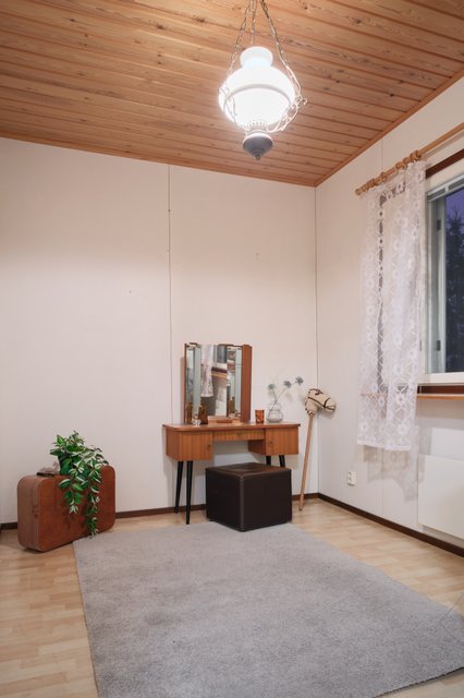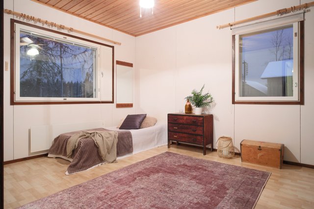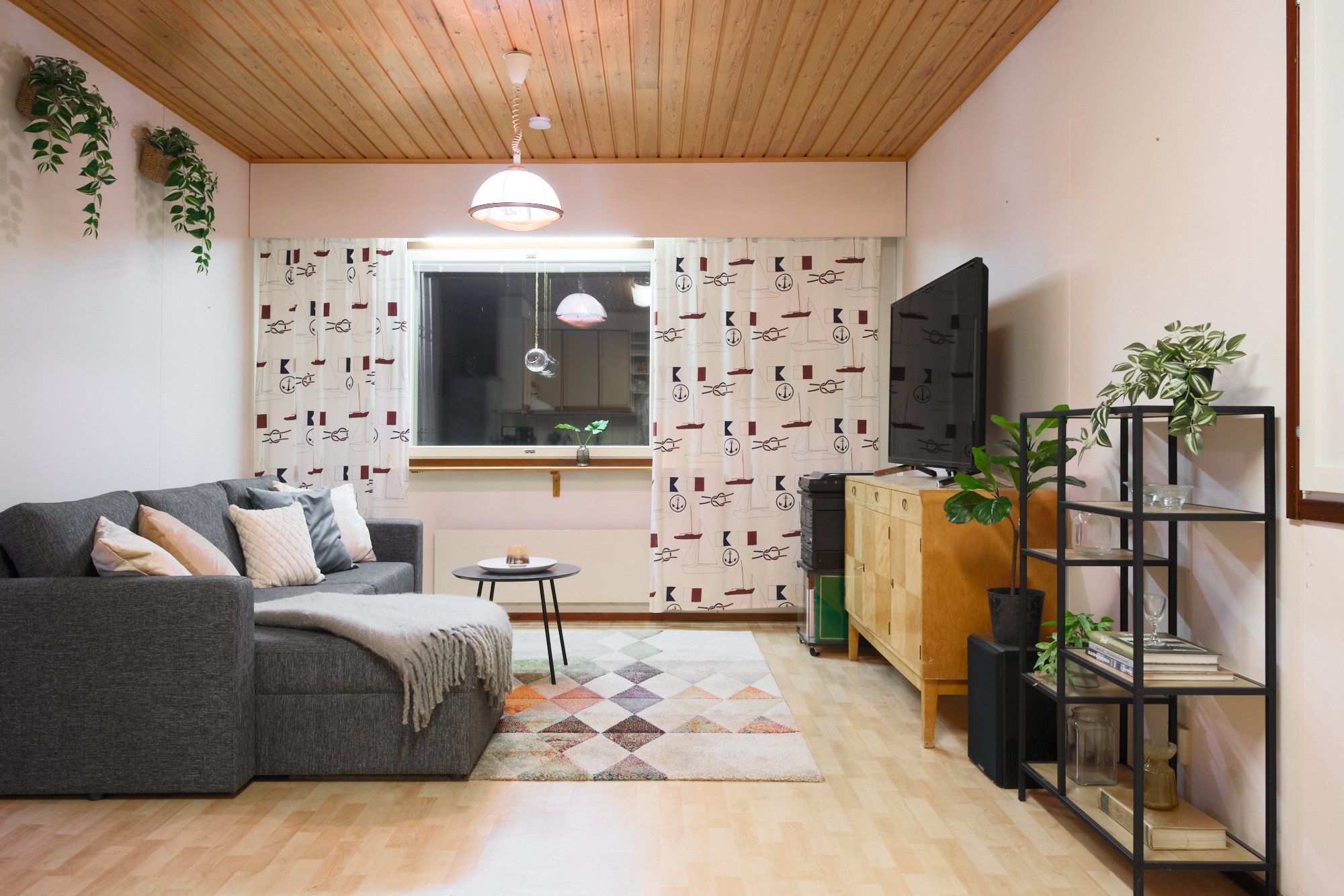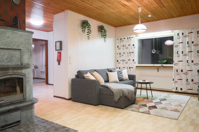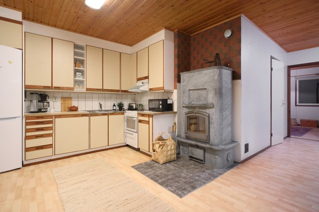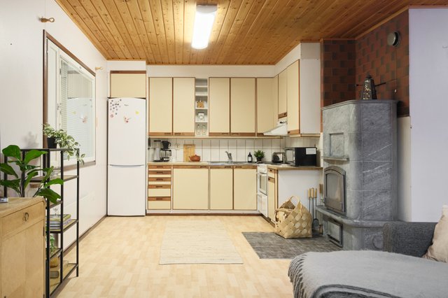 Kodin sydämenä toimii olohuoneen ja tupakeittiön yhdistelmä, jossa varaava takka luo lämpöä ja tunnelmaa. Keittiön alkuperäiset kaapistot ovat siistissä kunnossa, ja tila yhdistyy saumattomasti olohuoneeseen, tarjoten mukavan ympäristön yhdessäololle. Kaksi makuuhuonetta tarjoavat monipuolisia mahdollisuuksia esimerkiksi työ- tai lastenhuoneiksi.