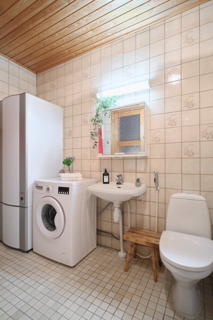 - Ikkunallisessa kylpyhuoneessa on tilaa erilliselle suihkunurkkaukselle ja pyykkihuollolle. Kylpyhuoneeseen on sijoitettu myös lämminvesivaraaja.