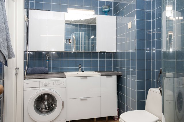 - WC-istuin, suihkuseinä (Liikkuvilla ovilla, asennettu v.2014), pesuallas, allaskaappi, pesukone (sekä tilaa pesukoneelle, pesukone v.2014.), peilikaappi, kodinhoitopöytä, ja pesukoneliitäntä
