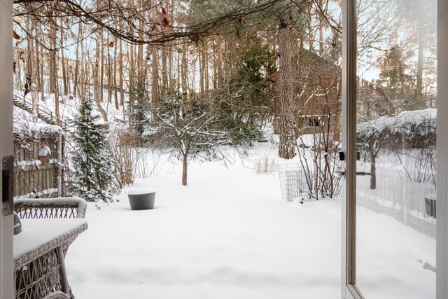 - Olohuoneesta käynti takapihalle, takapiha rajoittuu metsään. Luontonäkymä.