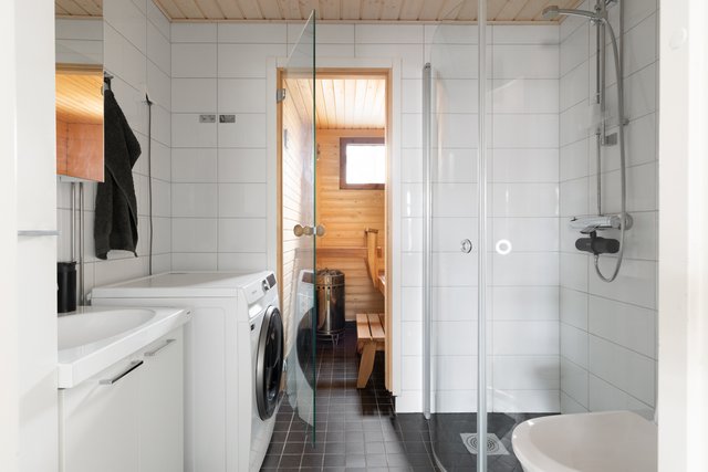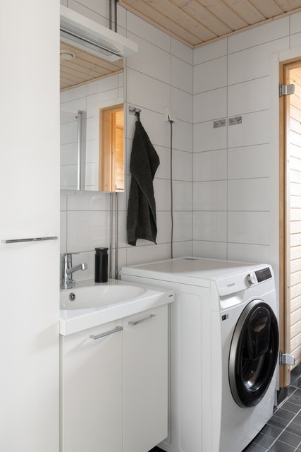 - WC-istuin, suihku, suihkuseinä, pesukoneliitäntä, peilikaappi, ja allaskaappi