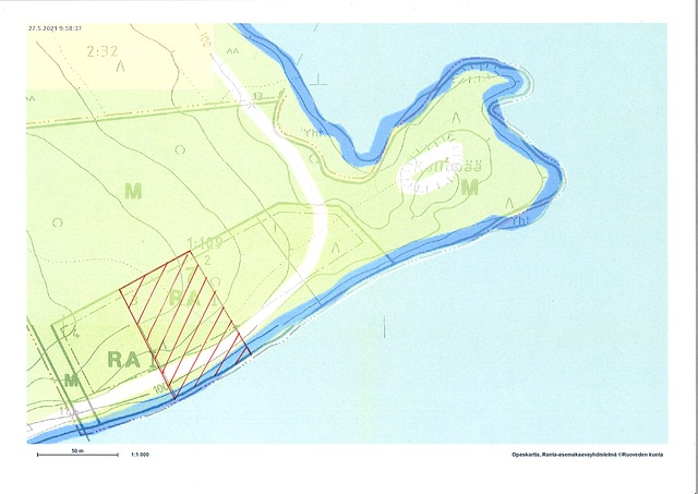 - RA Loma-asuntojen korttelialue. Rakennuspaikalle saa rakentaa yhden loma-asunnon sauna- ja talousrakennuksineen. Yhteenlaskettu kerrosala rakennuspaikkaa kohden on enintään 120 k-m2. Erillisen saunarakennuksen, joka on enintään 25 m2 kerrosalaltaan, saa sijoittaa rakennusalan ja rannan väliselle alueelle. Ei kuitenkaan 10 m:ä lähemmäksi keskiveden mukaista rantaviivaa.