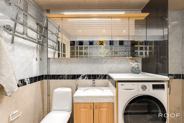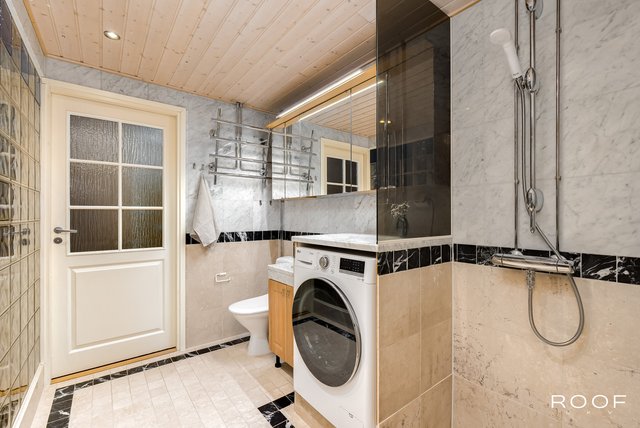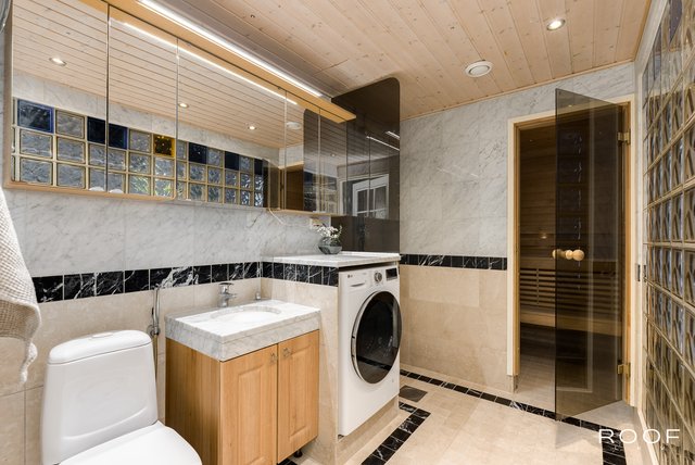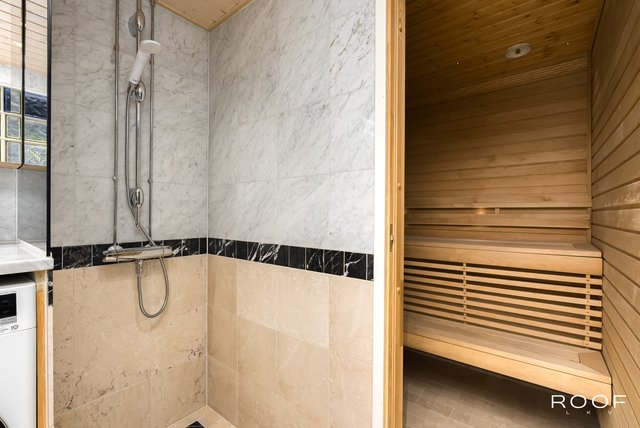 - Kph:n seinä- ja lattialaatat ovat marmoria, syväpuhdistettu ja nanopinnoitettu 02/2025. Varustus: suihkuseinä, pesukone, pesukoneliitäntä, lattialämmitys, wc-istuin, suihku, peilikaappi, peili, kiinteät valaisimet, kylpyhuonekaapisto. Lattia: laatta Seinät: kaakeli