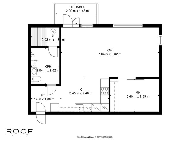 - Pinta-alaa ei ole tarkistusmitattu. Mainittu pinta-ala saattaa tämän ikäisessä kohteessa poiketa olennaisesti nykyisten standardien mukaan laskettavasta suinpinta-alasta. Todellinen asuinpinta-ala voi olla yhtiöjärjestyksessä, isännöitsijäntodistuksessa ja myyntiesitteessä mainittua pienempi tai suurempi. Kohteen markkinoinnisssa käytetään mittatiedoilla varustettua pohjapiirrosta. Pohjapiirroksen tarkoitus on helpottaa ostajan ostopäätöstä ja selvittää asunnon nykyinen huonejako. Lukija on tietoinen, että pohjakuva on suuntaa antava, ei mittakaavassa, eikä perustu virallisiin piirustuksiin. Pohjapiirroksessa näkyvät mitat on luotu automaattisesti3D-skannauksesta (leveys x pituus).