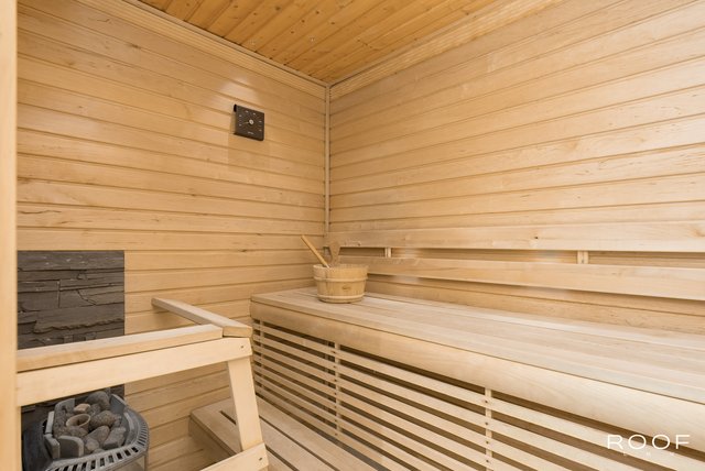 - Kiukaan takana koristekivetys Lattia: laatta. Seinät: kivi, puu. Kiukaan tyyppi: sähkökiuas.