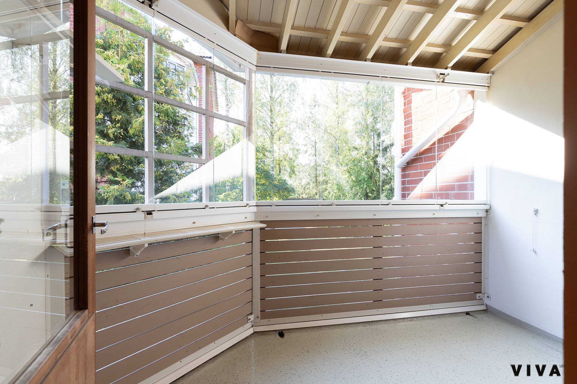 kuosissaan. Talossa on kaksi kerrosta ja tämä asunto sijaitsee ylemmässä kerroksessa. Asunto on päätyasunto ja ikkunoita on täältä kahteen suuntaan. Iso lasitettu parveke on suunnaltaan etelään.