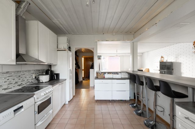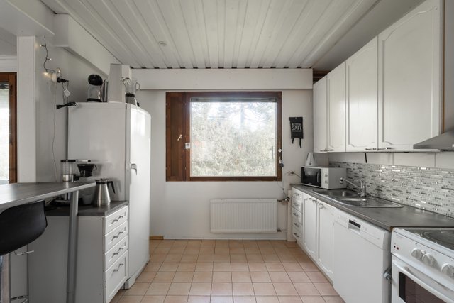 - Täyskorkeat jääkaappi ja pakastin, sähköliesi, liesituuletin, astianpesukone. Lattia laminaattia, seinät maalattu ja työtasot laminaattia.