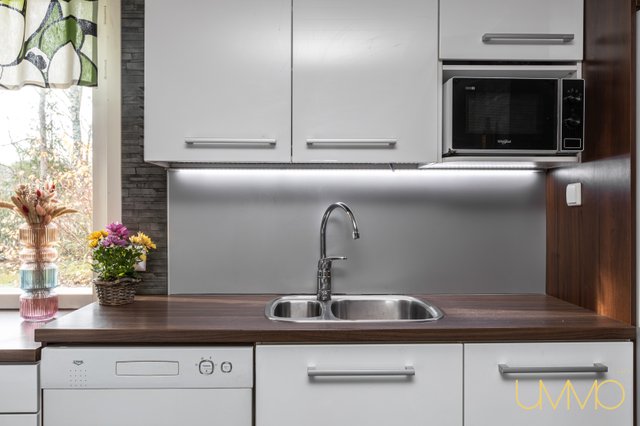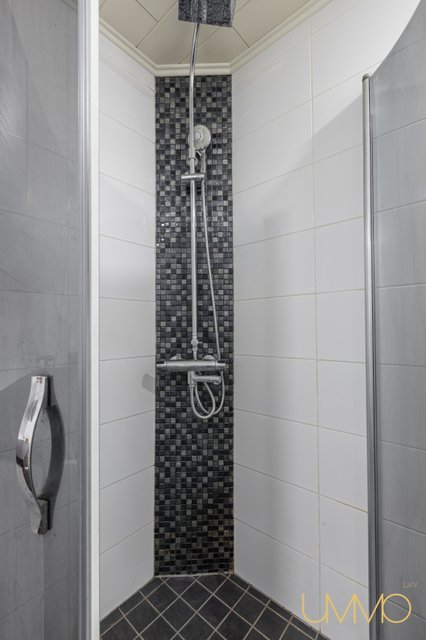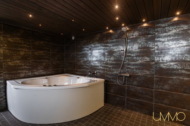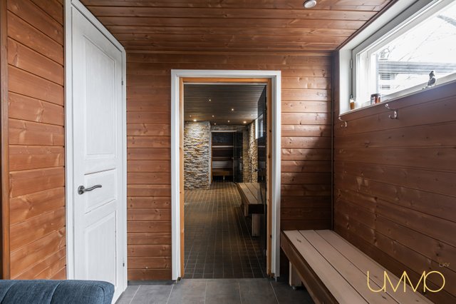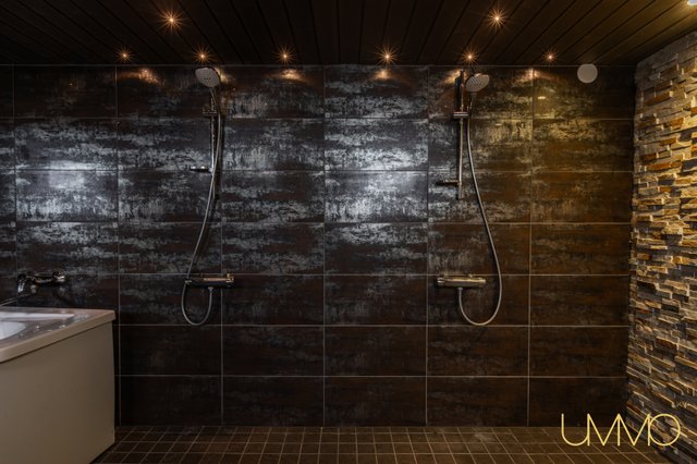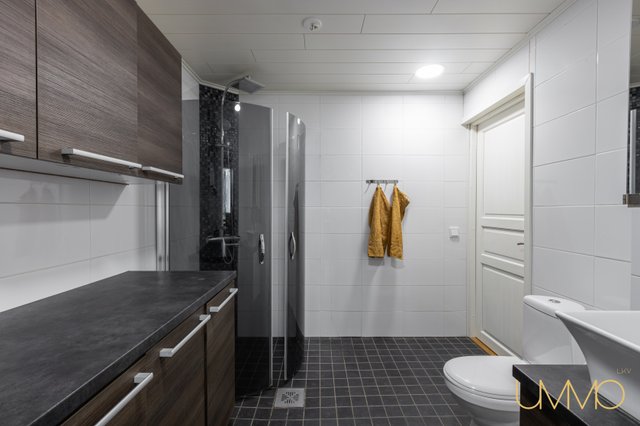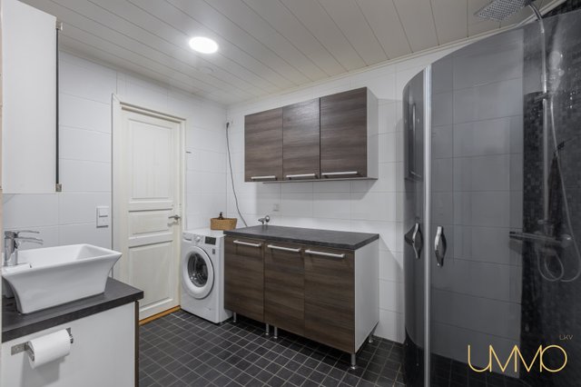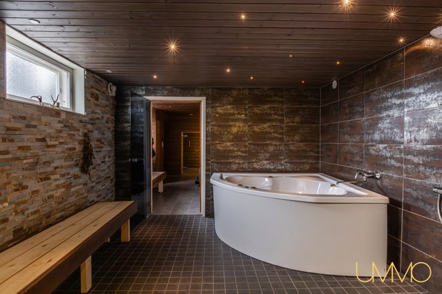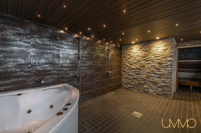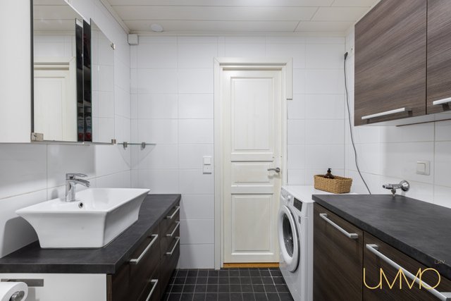 - Yläkerran pesutilat: suihku, wc-istuin, lavuaari, allaskaappi, pesukoneliitäntä, taitettavat suihkuovet, peilikaappi, kodinhoitotaso sekä hyvin säilytystilaa. Alakerran pesutilat: kaksi suihkua, poreamme ja sähkösauna.