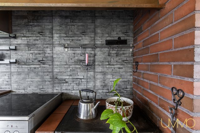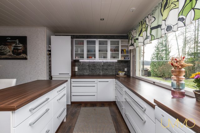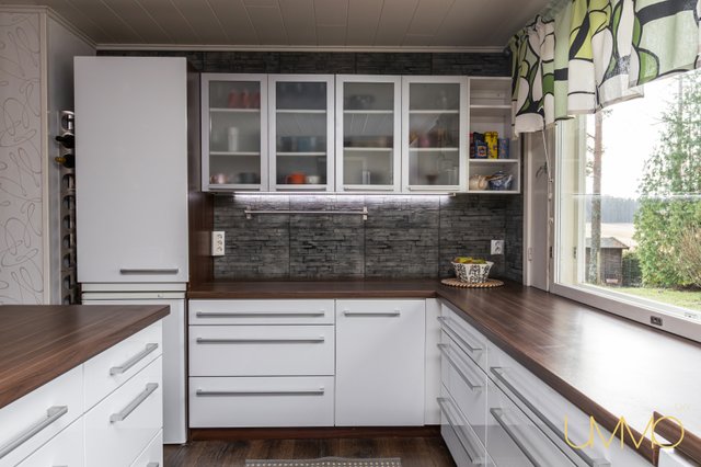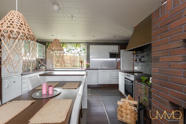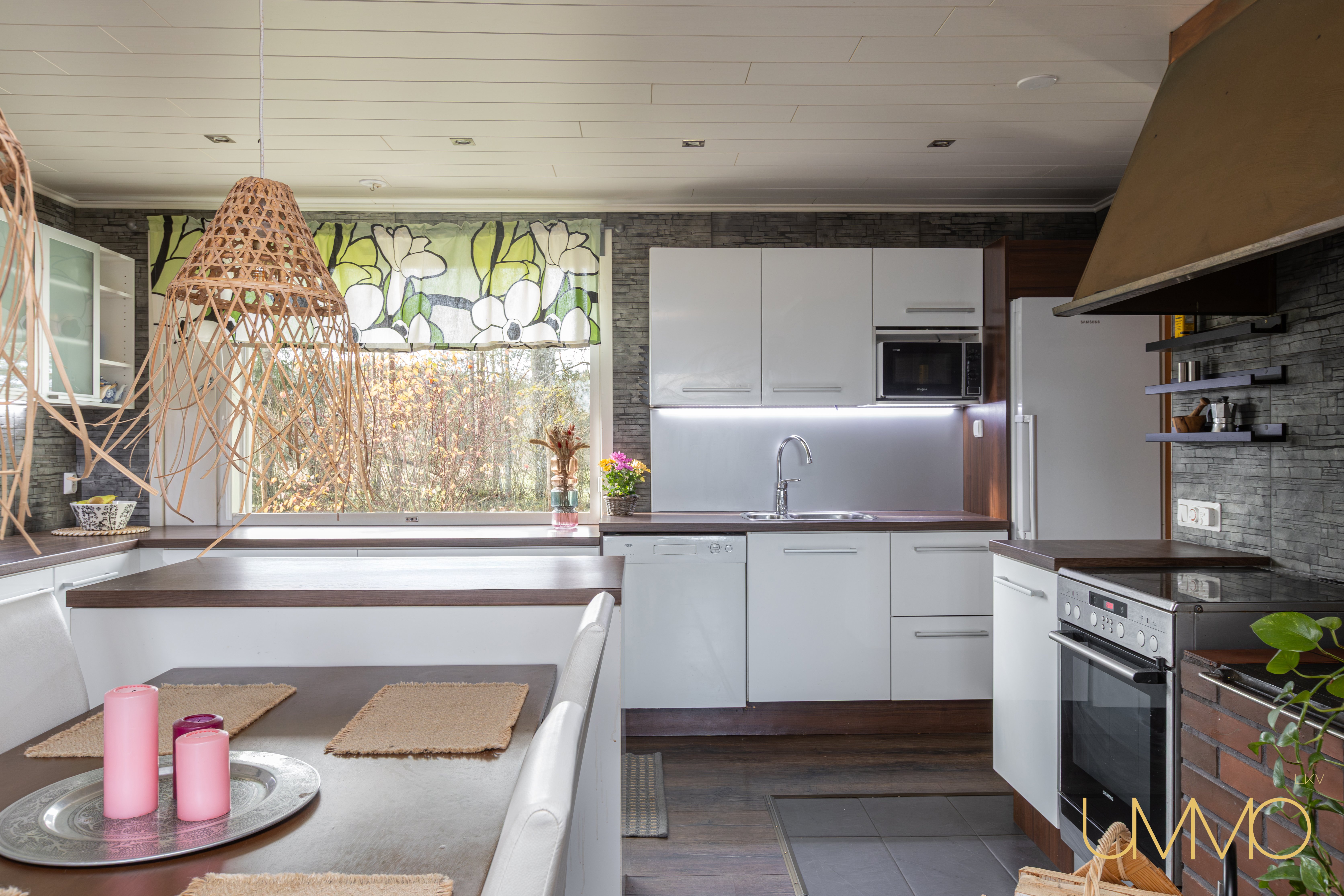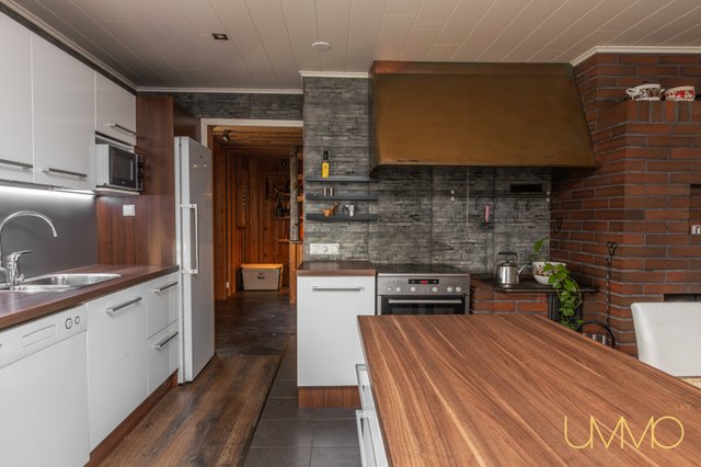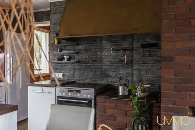 - Vaalea tilava tupakeittiö remontoitu noin vuosina 2012-2017. Keittiön kruunaa aikakaudelleen tyypillinen tiilinen varaavatakka sekä puuhella.