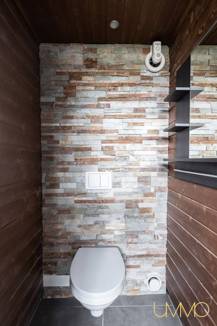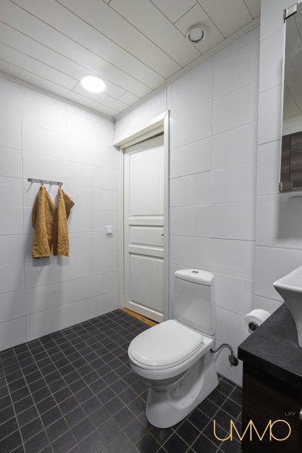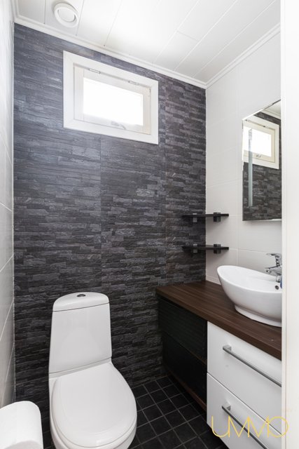 - Kaksi erillis-wc:tä, toinen yläkerrassa ja toinen alakerrassa. Yläkerran wc: laattalattia, kaakeliseinä, allaskaapit, allas ja peili. Alakerran wc: laattalattia, osittain koristekiveä ja puupaneelia seinät.