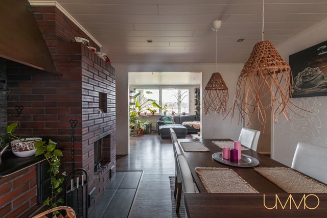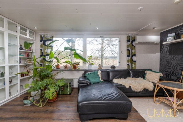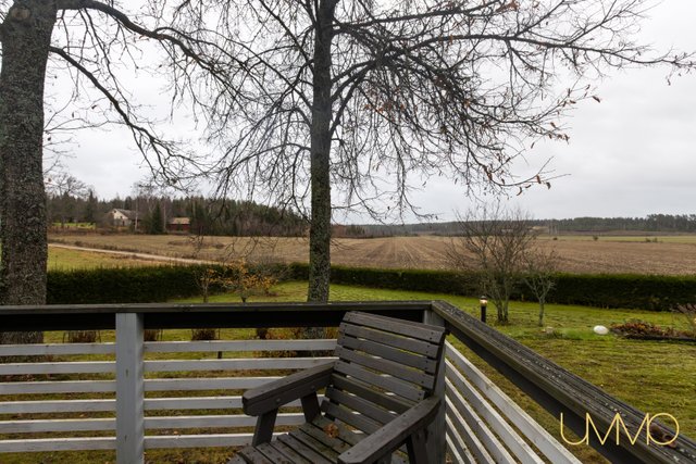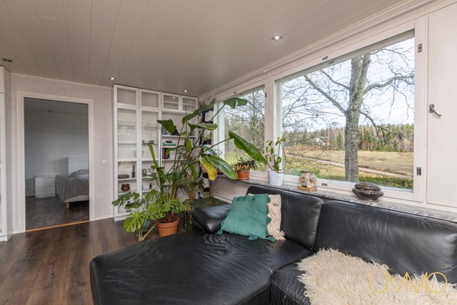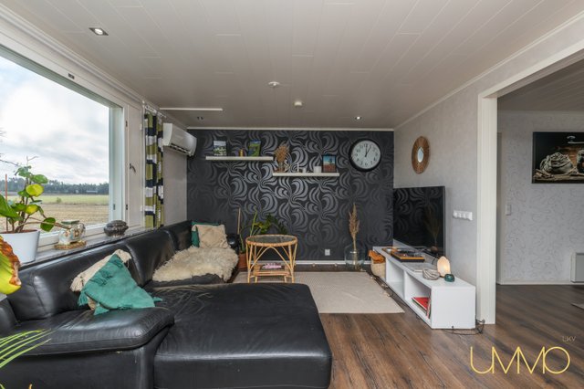 - Valoisa olohuone, josta upeat näkymät pitkälle peltojen yli. Olohuone osittain avoin keittiöön.