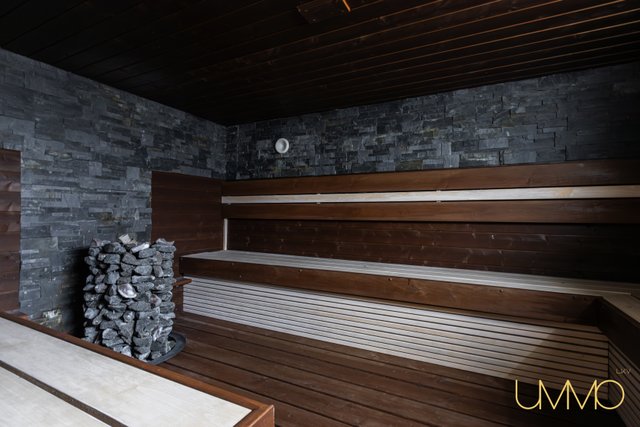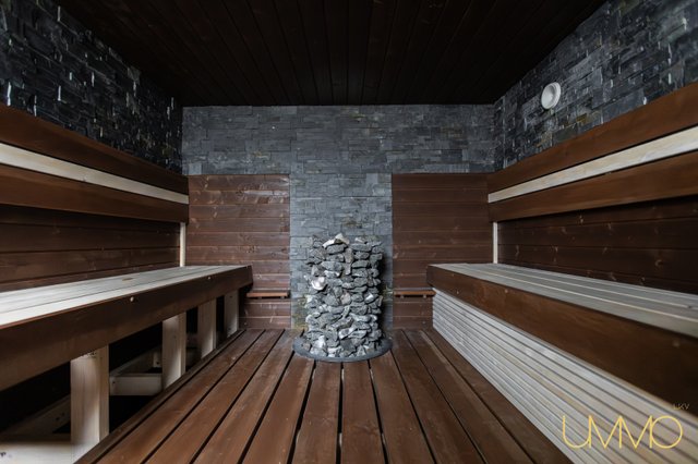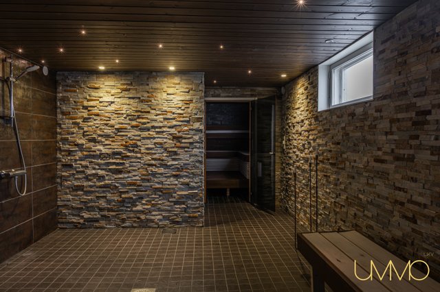 Kodin alakerta on jokaisen saunojan paratiisi. Tilavaan saunaan mahtuu useampikin saunoja ja kylpyhuoneen puolelta löytyy poreamme sekä kaksi suihkua. Pukuhuoneesta on kulku takapihan terassille, jossa kelpaa viilentyä ympäri vuoden.
