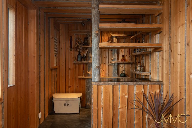 - Baarihuone/pukuhuone/takkahuone, josta kulku suoraan ulos. Eteinen ja eteisaula, kaapistoineen. Autotalli sekä varastotilaa pää rakennuksessa. Erillinen autotalli/talousrakennus sekä varastotilaa.